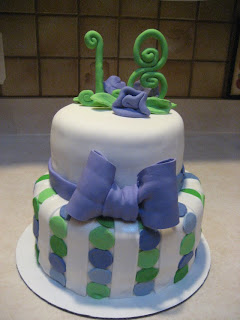 Her favorite colors are purple and green. I wanted a desgin different from what I am used to doing so this is what I came up with. The bottom cake is sugar cookie cake and the top cake is white almond sour cream cake and they are both covered in fondant. The poor cake had to be part of a 10 minute long photo shoot with everyone in my family taking pictures of it hehe.